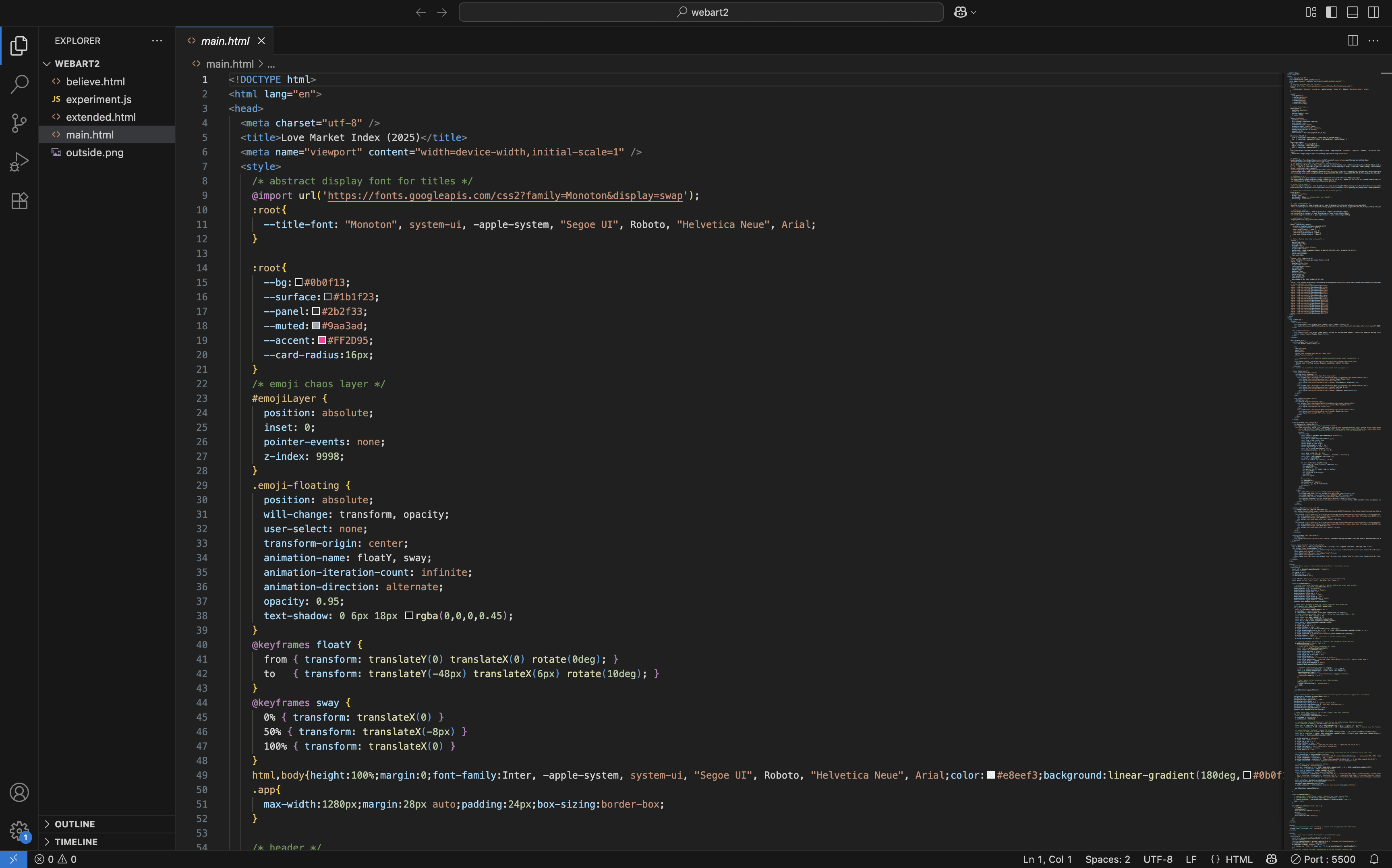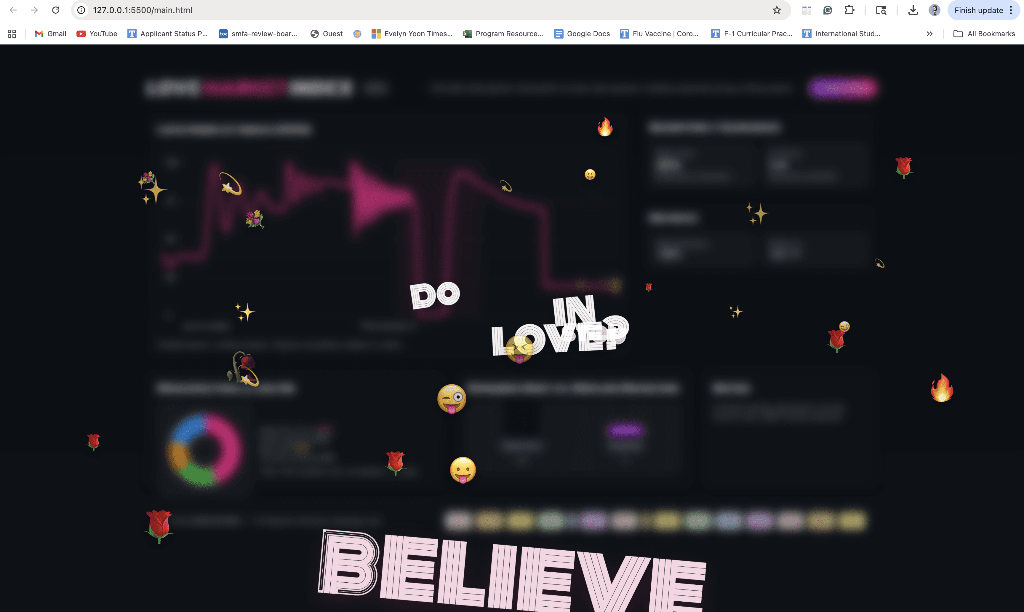 LOVE MARKET INDEX (2025) is a playful, finance-inspired dating dashboard I designed and built to visualize modern romance like a volatile stock chart, complete with “quarterly guidance,” chaotic metrics, and tongue-in-cheek data storytelling. I focused on a sleek dark UI, bold typography, and interactive micro-details like a “Toggle Chaos” mode to turn feelings into readable, funny market signals while practicing layout systems, chart styling, and front-end polish.