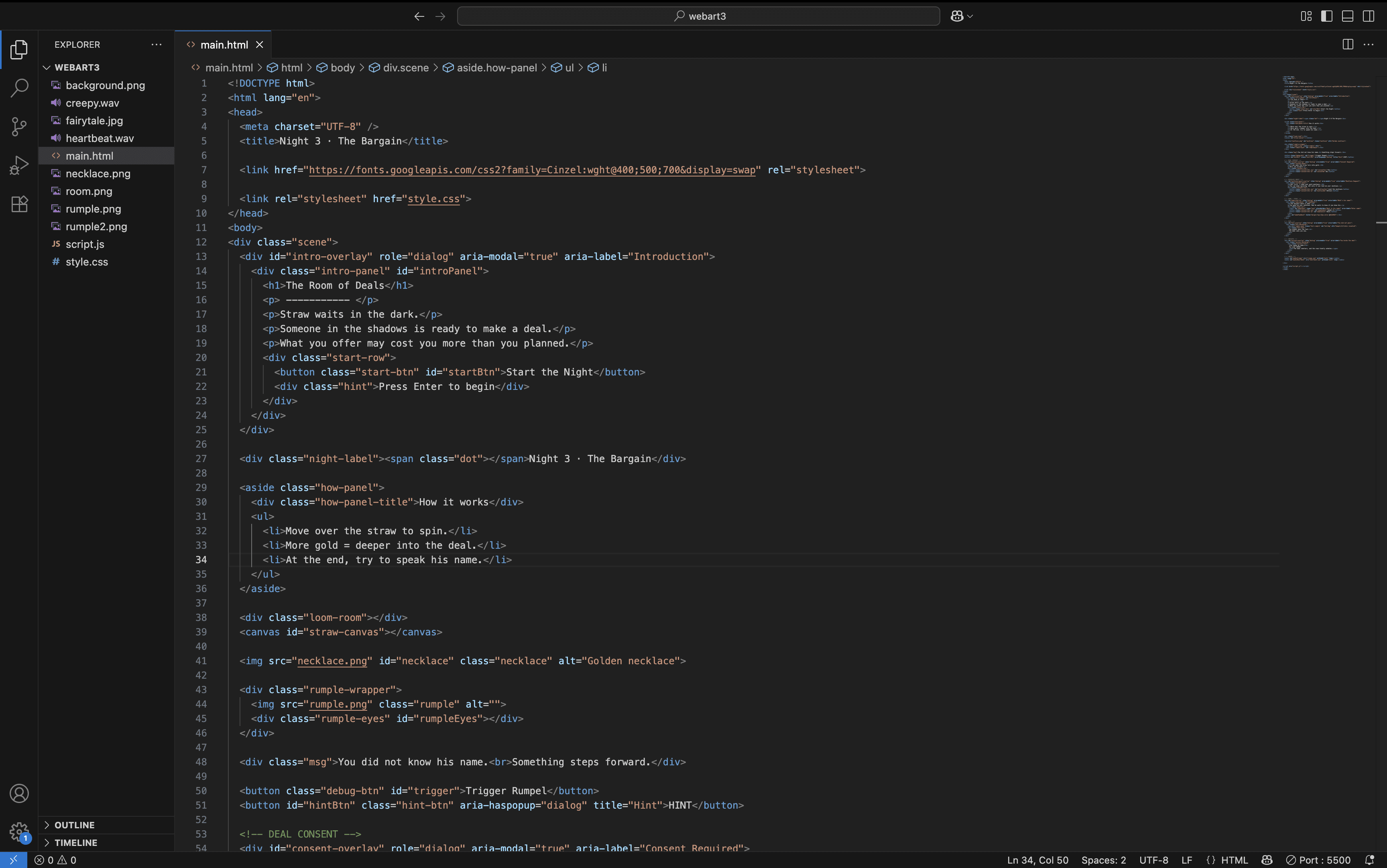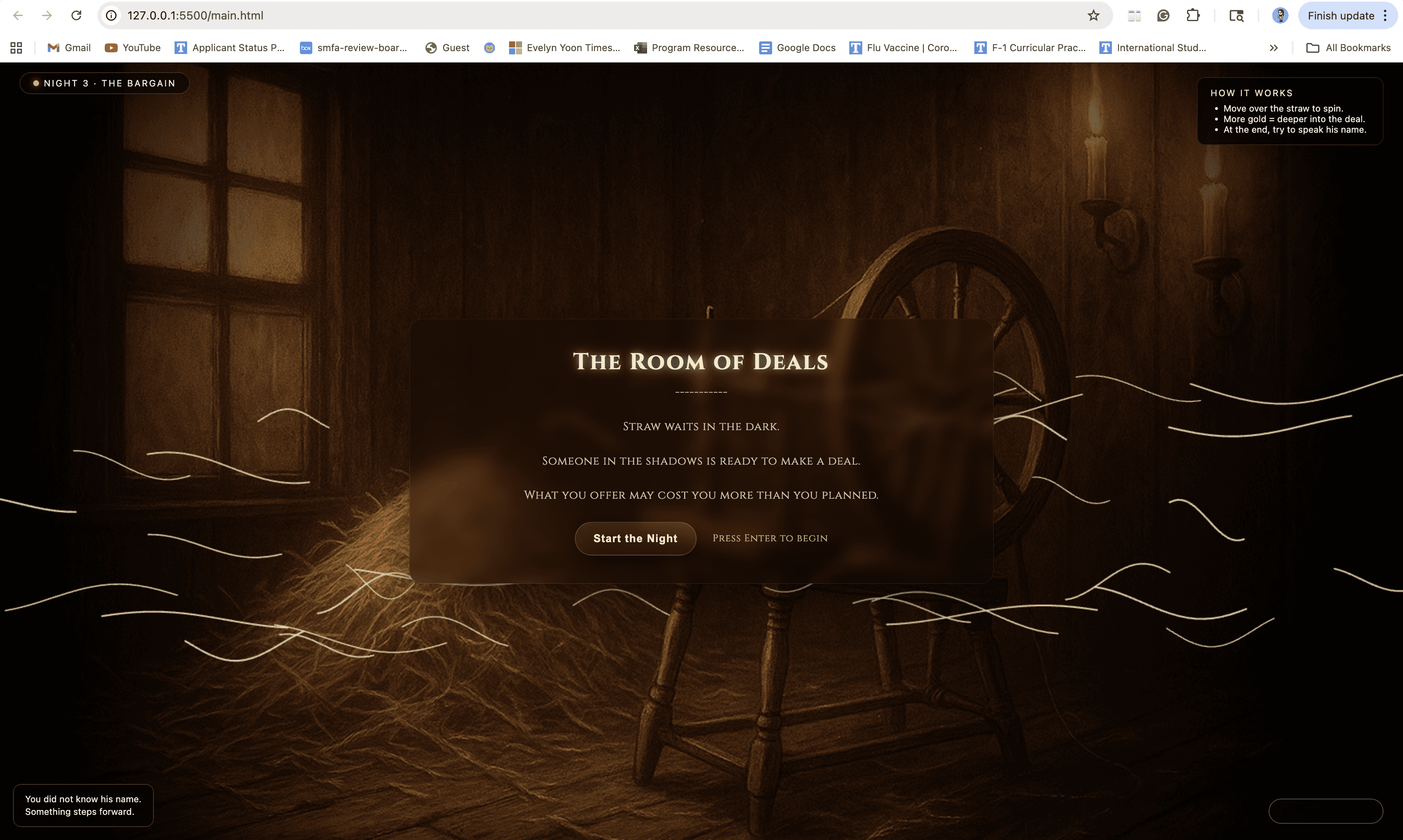 THE ROOM OF DEALS is an interactive story experience I created by reimagining Rumpelstiltskin through themes of desperation, secrecy, and transformation. I chose this story because it frames identity as currency, and I wanted to translate that tension into a digital space where the user feels the pressure of making a deal. Set in a dark, surreal medieval atmosphere, the piece uses straw-to-gold symbolism, shadowy visuals, and unsettling sound to evoke anxiety, curiosity, and empowerment as the player navigates a non-linear path toward reclaiming control by uncovering the “name” behind the power.